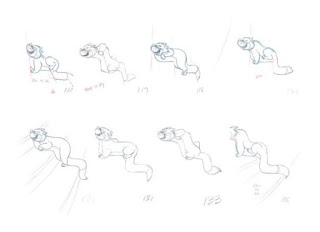 Somehow Milt times these moves so beautifully, and he takes great advantage of overlapping action such as toes, the head, and all that fur. The animation is therefore fluid; it is easy to read on the screen and a joy to watch.
